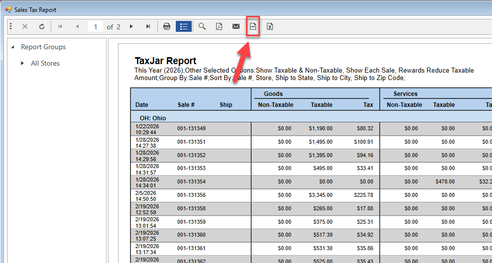 The TaxJar report has a very specific use. The TaxJar report allows you to run the Sale Tax report and export it in a specific format, to upload to TaxJar. Click the highlighted icon to export the report you have run.