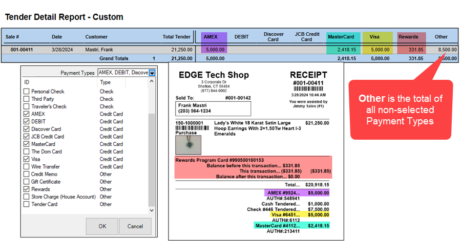 Transactions will only be shown in the Custom Tender Detail Report if they match one or more of your selected payment types. If a transaction was paid using multiple payment methods and one or more match your selections, it will be included, and any payment methods that did not match your selections will be lumped together in the Other column.