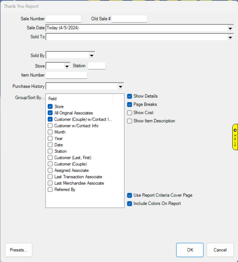 The Thank You report details a combination of information useful for following up with customers. It shows contact information and sales history for customers, and is the best report to quickly give you customer information and recent purchases within a specific time-frame. It is grouped by Original Associate, which might be useful in helping you easily reach out to customers with a personalized thank you note and/or email thanking them for their business. The query for it is similar to that of activity reports.