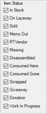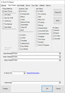 - For Item Status, choose all statuses. This may seem counterintuitive, but this filter is looking at the item’s current status initially and then will analyze the item’s history to check what its status was on the In Stock On date. If it was in stock on that date, it will be included.