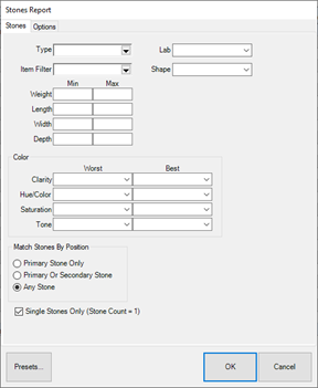 Select the types of stones to include. Note that the other available filters and options on this form will vary depending on the stone type(s) selected.