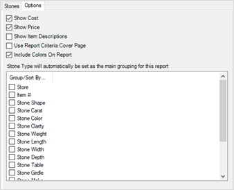 Additionally, like all reports, you can drag and drop to rearrange these options to change how the report will sort. Even if a grouper is not checked, it will still be honored for the sort. For example, dragging Stone Weight to the top of this list would sort the stones by their weight.