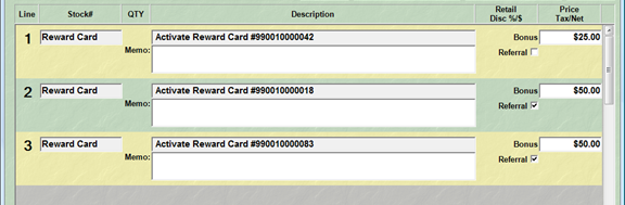 In the above example, you see that we are issuing a reward card to the present customer, with a $25 initial value, and also two $50 cards for him to give away.