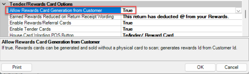 - Set the Allow Rewards Card Generation From Customer option to True.