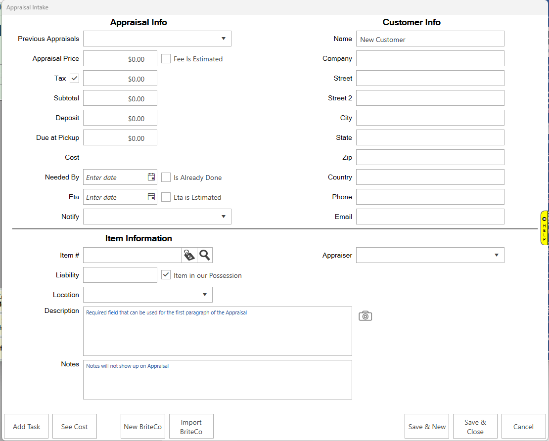 - Enter information about the item being appraised. This is not the actual appraisal (that is completed later in the back office). The only required field is Description.