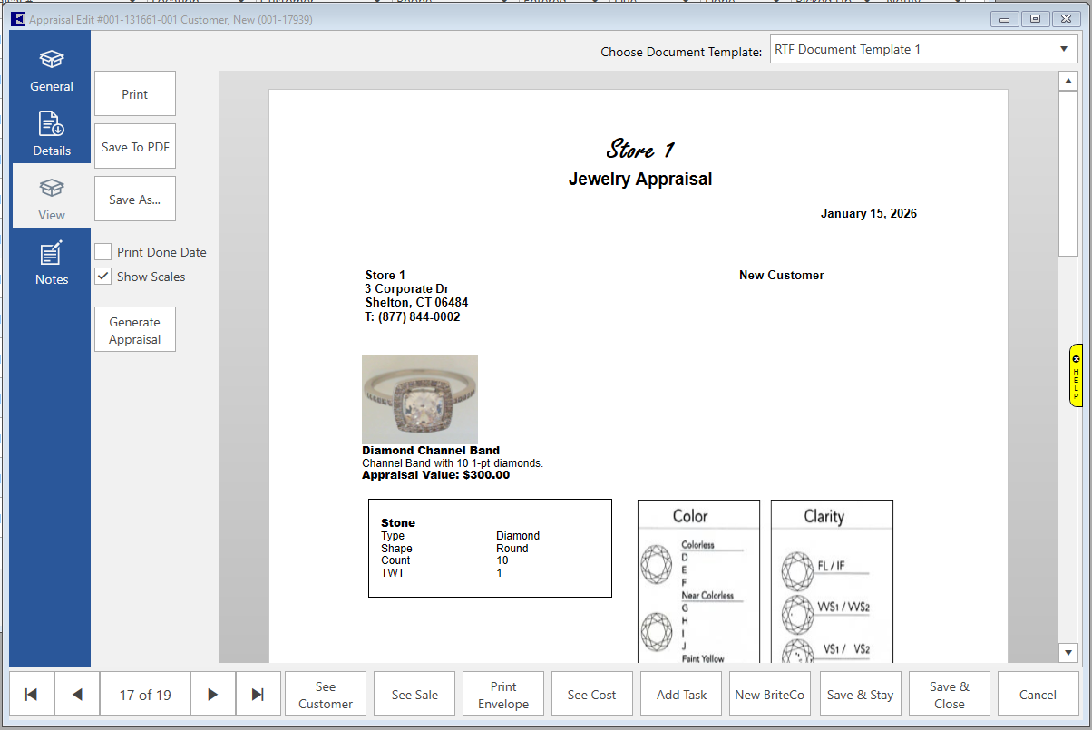 Click this to bring up the Add Stone form. Stone information and scales will not print on the appraisal if no stones are added.