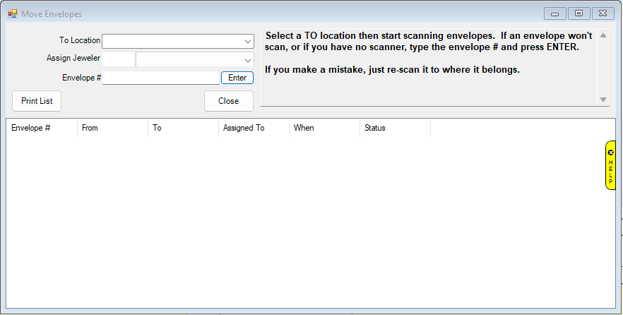 Essential to the Repair and Custom Job processes is the ability to track the location of each job in the process. The Edge provides a Move function to update the system’s knowledge of where each envelope is located. You must have supervisor status to move a repair from one location or envelope to another.