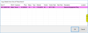 - Specify vendor and vendor style. The Edge will search inventory for matching items and, if it finds any, the Copy Details window will appear. Any open special orders will appear highlighted purple in this window.