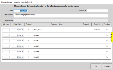 - Enter the quantity received in the Allocate field for the customer's special order, then click OK.