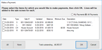 - Check one or more transactions and click OK. A sale line will appear for each payment selected.