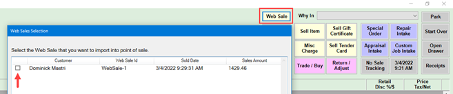Sales can be imported from the website. When a sale is imported, it is added to the Web Sale queue and must be manually finished at POS. There is a Web Sale button that will appear at the top of the POS screen.