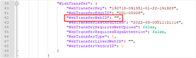 And it includes the paired WishTransfer object. This is used to link your own wish list record to The Edge’s wish. Your unique wish identifier goes into the WebTransferWebID field. All other fields in this object should not be changed as they are used by The Edge.