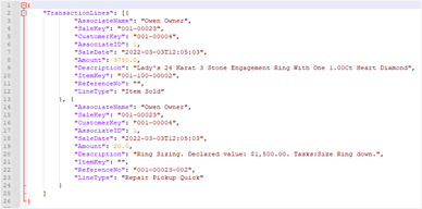 Customer sales history. Depending on the amount of sales, this file may be split. Split files will be prefixed sequentially, i.e., 1-2022-03-03-12-00-Transaction.json, 2-2022-03-03-12-00-Transaction.json, etc.