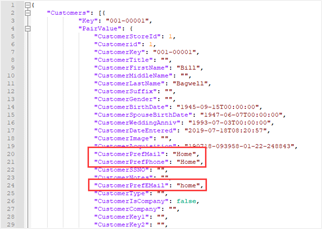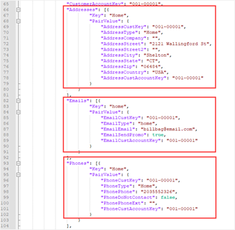 Customer data with paired objects for addresses, emails, and phone numbers.