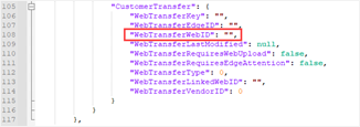 And it includes the paired CustomerTransfer object. This is used to link your customer record to The Edge’s customer. Your unique customer identifier goes into the WebTransferWebID field. All other fields in this object should not be changed as they are used by The Edge.