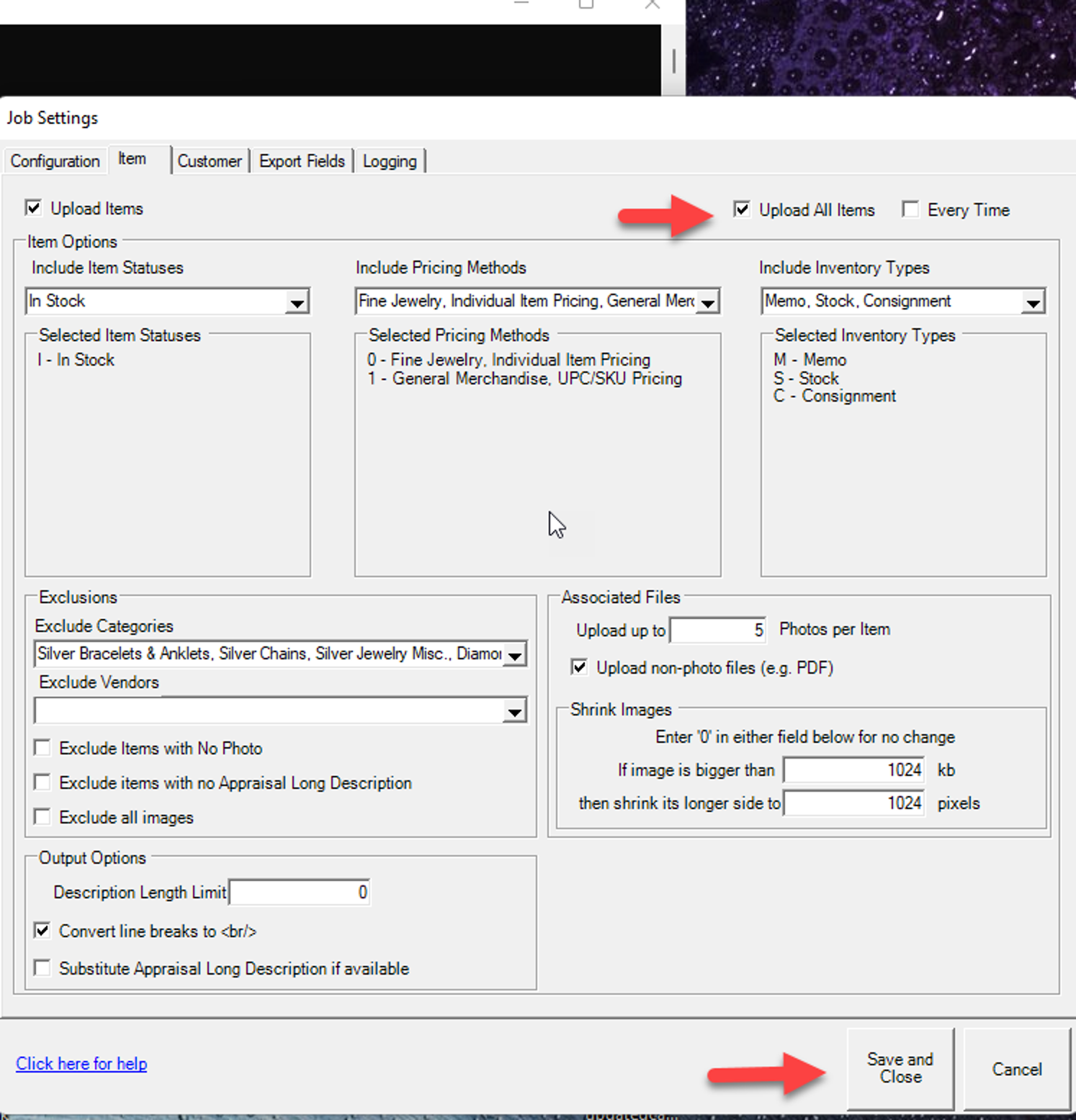 - Once in the Job Settings, click on the Item tab. In the Item tab there is a checkbox “Upload All Items”. Check that and click Save and Close as shown in the image below: