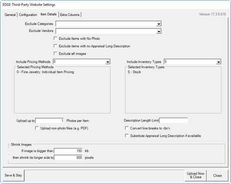 The Item Details tab allows you to filter items uploaded by vendor, pricing, and description. It also helps size images to ensure picture files aren’t too large for the web.