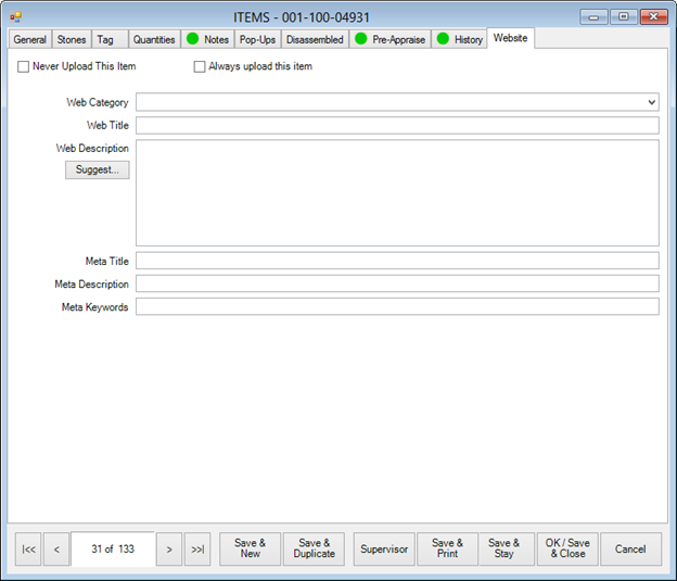 Once you have set up upload instructions for the site, new items will be automatically included unless you specify otherwise in the item record. The Website tab will appear in the Item Add screen. Complete these fields to provide item-specific instructions for upload.