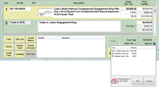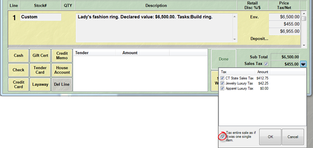 The new luxury tax is calculated based on the final selling price of the custom piece. There is no differentiation between labor and parts. When processing a custom job transaction, you must click the dropdown arrow next to Sales Tax and check the Tax entire sale as if it was one single item checkbox. Also, the sale MUST be limited to only the single custom job; you cannot mix other types of transactions on this sale.
